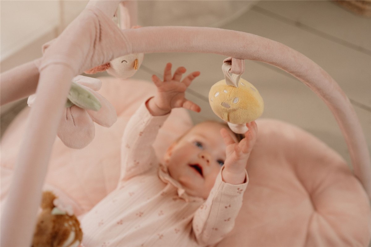 ¡Hay tanto para ver, tocar y oír! Cada día es una aventura con esta alfombra de juego con forma de flor. Presentada en un suave tono rosa, tiene dos arcos de pana con cinco peluches colgantes diferentes de la colección Fairy Garden. El pequeño ciervo, el pájaro, la flor, el hongo y la fresa ayudarán a desarrollar las habilidades sensoriales y la coordinación mano-ojo.