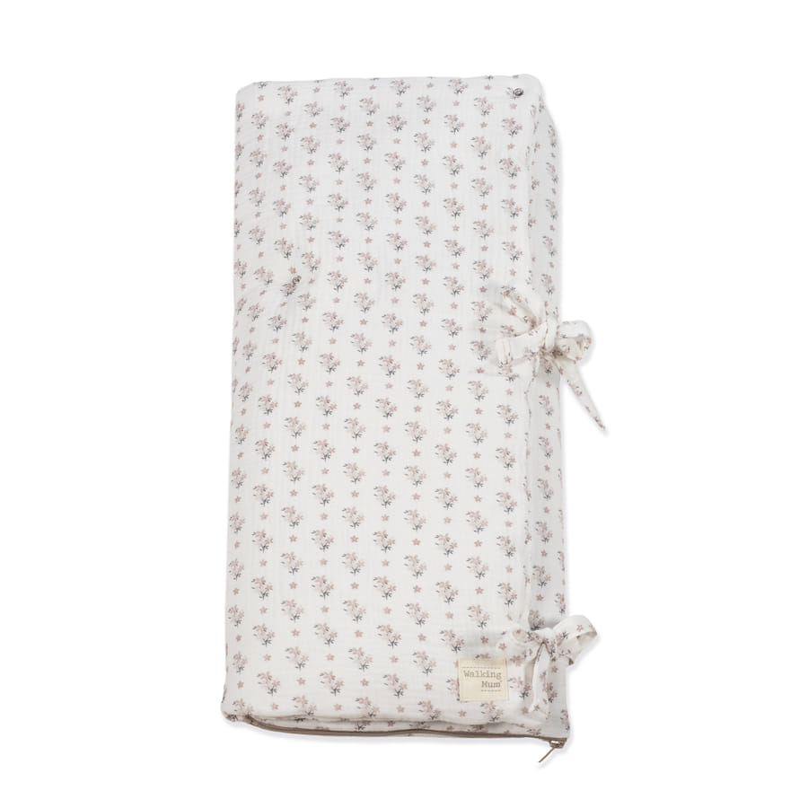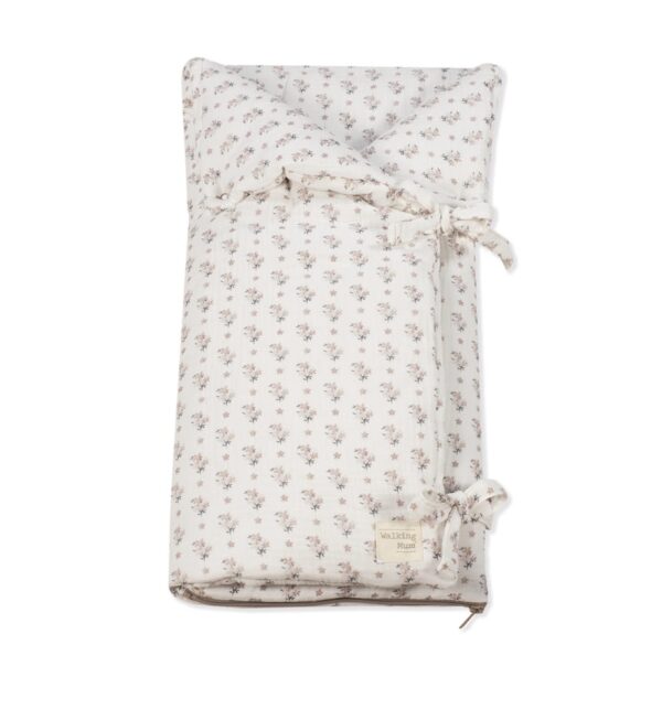 Saco arrullo o saco manta Botton con estampado floral. Está fabricado con una suave muselina 100% algodón. Ideal para los primeros dias del bebé. Es perfecto para los primeros paseos en el capazo. Se convierte en una manta para la cuna. Practico cierre tipo sobre con lazos y cierre con cremallera en la parte inferior en los pies para que el bebé esté abrigado. Gran calidad y mucho estilo. Fabricado en materiales resistentes y de fácil limpieza a mano o a máquina a 30 °C. Walking Mum protege a tu bebé utilizando los mejores tejidos, libres de colorantes azoicos y sustancias nocivas para la salud. Nuestra colección Walking Mum está diseñada con un particular sello de estilo urbano y moderno que no pasa desapercibido, para vestir diferente los paseos con tu bebé. Los accesorios de esta línea son más sport y prácticos, especialmente pensados en mamás y papás modernos que aprecian los diseños más actuales y en tendencia sin dejar de lado la calidad y la funcionalidad de los complementos que hacen más cómodos todos los paseos con sus bebés. Especificaciones: Materiales: 100% algodón. Medidas cerrado 38×73 cm y abierto 97×73 cm.