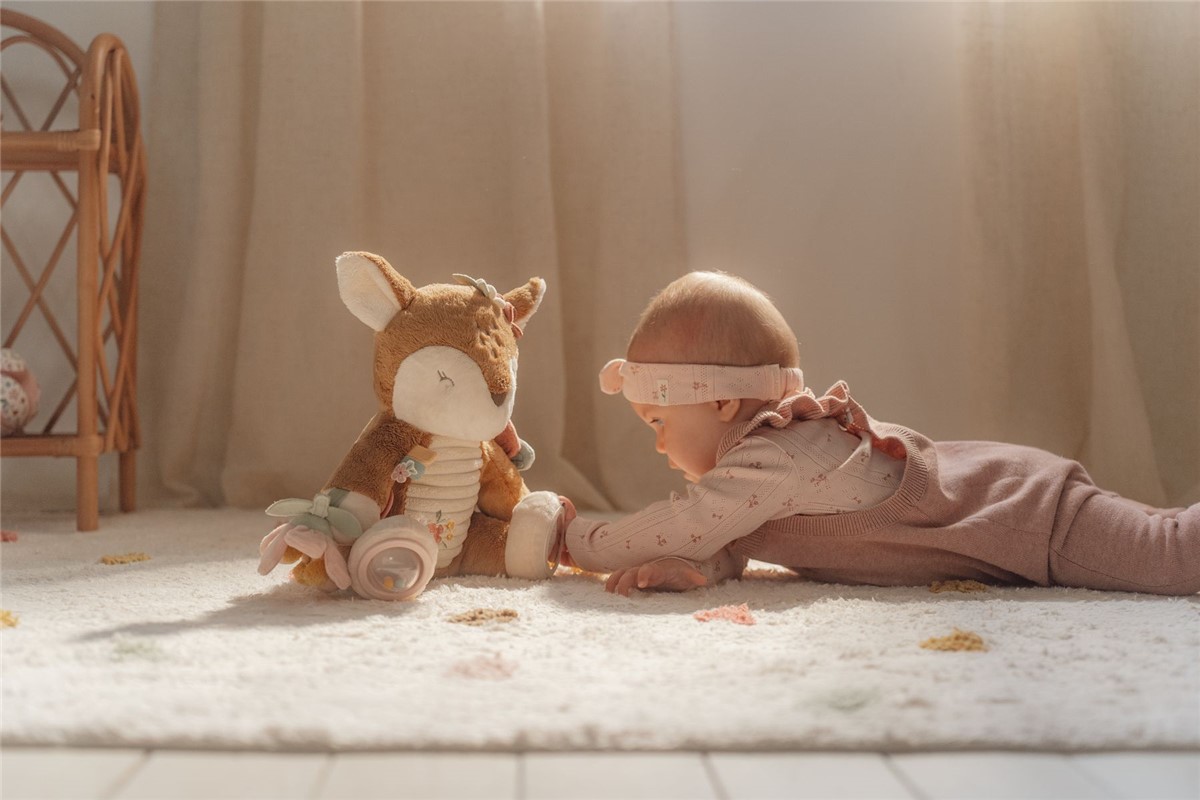 ¡Abrazos y juegos! Este adorable ciervo promete mucho más que abrazos. Descubre todas las actividades divertidas que esconde. Tiene una mariposa que se arruga en el hombro, un sonido de cascabel y etiquetas y flores para tocar y sentir. Los anillos alrededor de la pierna, el espejo en un pie… son tantos detalles que despertarán la curiosidad de tu pequeño. Y después de todo ese juego, el adorable ciervo inspira los sueños más dulces sobre un jardín de hadas.