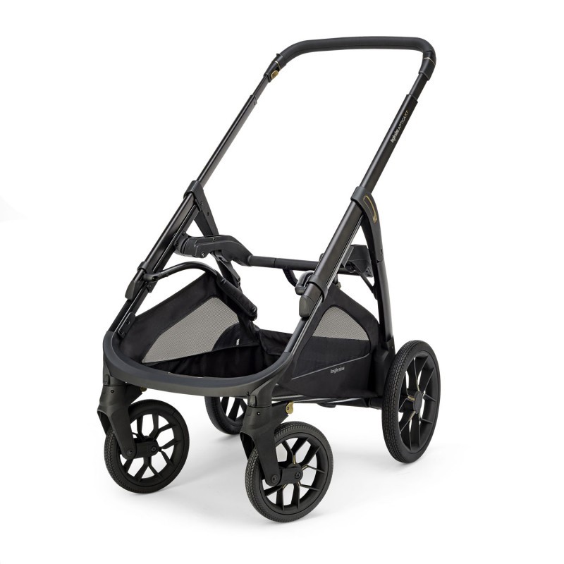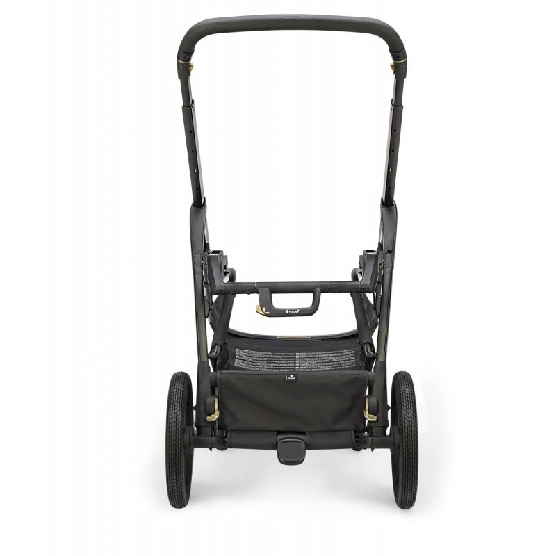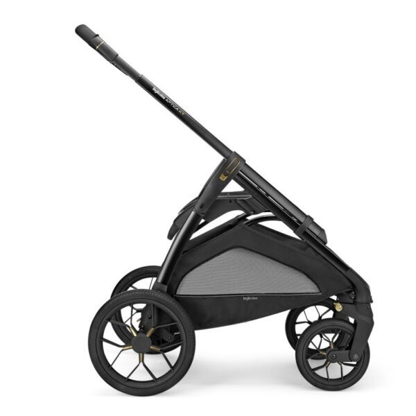 Chasis de aluminio con manillar unido forrado de piel sintética. Amortiguación en las 4 ruedas para su fácil adaptación tanto a calles con adoquines, como senderos para tus excursiones rurales garantizando la máxima comodidad del Bebé.