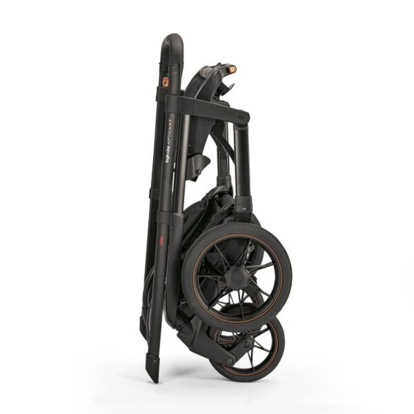Destaca por su cierre el cual lo haces con una sola mano tanto el chasis independiente como con la silla montada, quedando en posición vertical de pie sin que ni manillar ni vestidura toque el suelo.