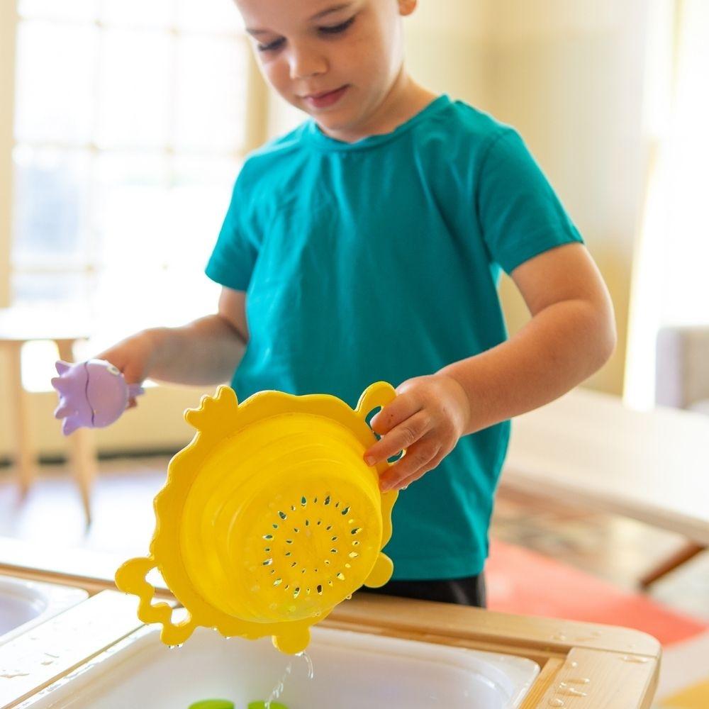 Su uso repetitivo (coger–soltar, verter, colar) refuerza la motricidad fina, la coordinación ojo-mano y la concentración, además de invitar al juego abierto: clasificar, trasladar, “buscar y encontrar” o crear pequeñas escenas con distintos materiales (arroz, legumbres grandes, pompones, agua, etc.).