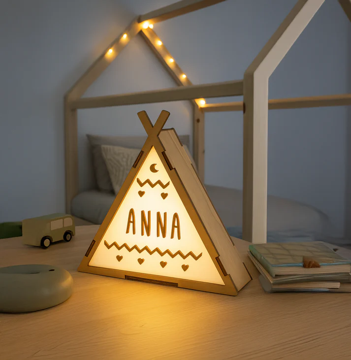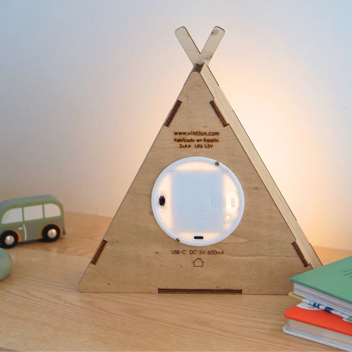 Nuestra Lámpara Tipi está diseñada en madera y cuenta con luz cálida para crear un ambiente acogedor y relajante.