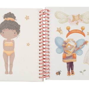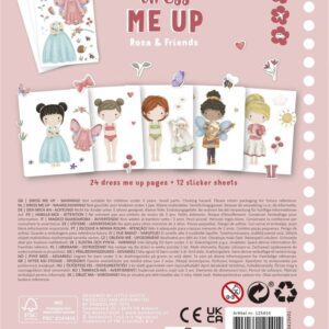 Libro viste a Rosa & Friends con anillas. Contiene 24 páginas con modelos y 12 hojas de pegatinas con atuendos y accesorios. Con tapa dura, ideal para jugar en casa y para llevar.