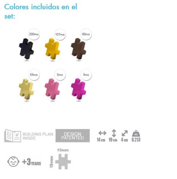Este garantiza diversión para estimular el desarrollo de los más pequeños. Son piezas ingeniosamente diseñadas, para construir objetos en 3D y hacer fabulosos mosaicos jugando de manera creativa.