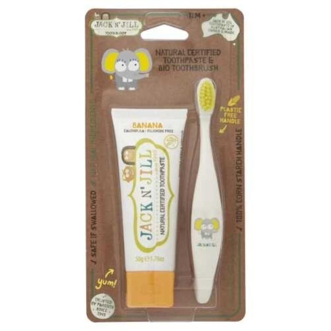 Este pack contiene una pasta de dientes natural sin sabor Jack N` Jill de 50 g y un cepillo de dedo de silicona Jack N` Jill con un práctico estuche.