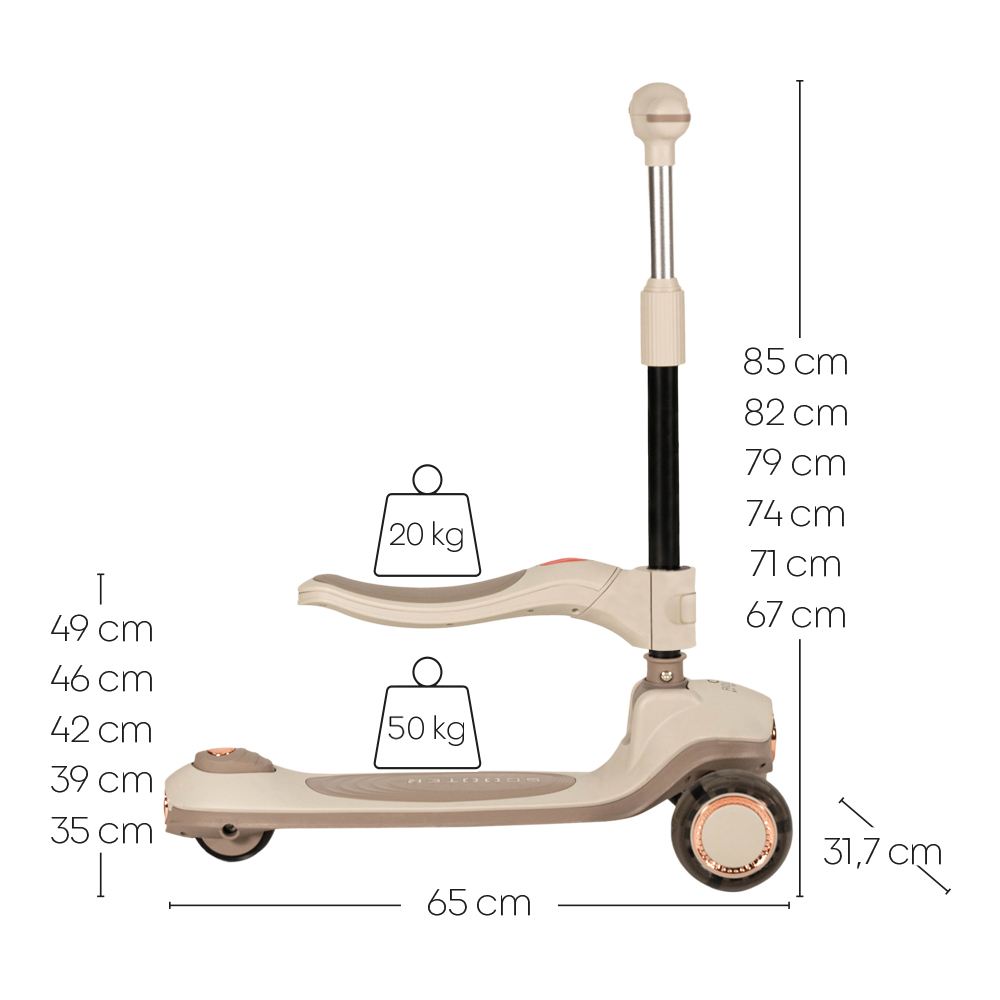 – Modo patinete: a partir de 24 meses hasta 50 kg. Medidas: 65 x 32 X 67 / 85 cm.