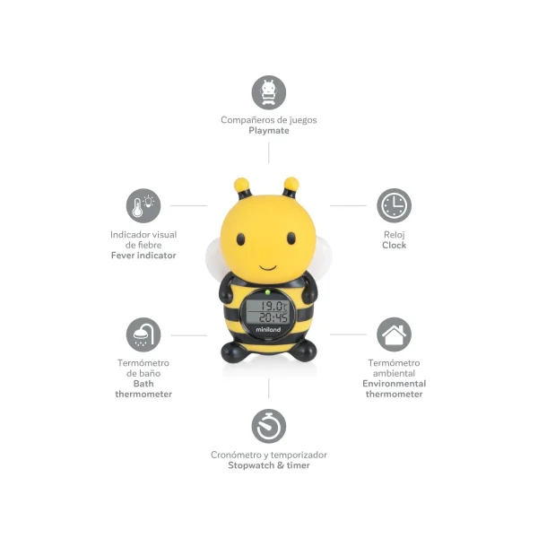 Baños agradables y llenos de diversión. thermo bath es una simpática abeja compañera de juegos del bebé en los momentos del baño, además de un termómetro que mide tanto la temperatura del agua como la del ambiente del baño, garantizando siempre una atmósfera agradable y divertida.