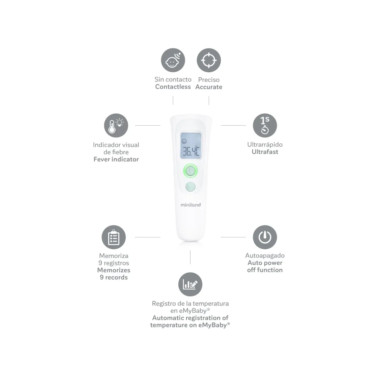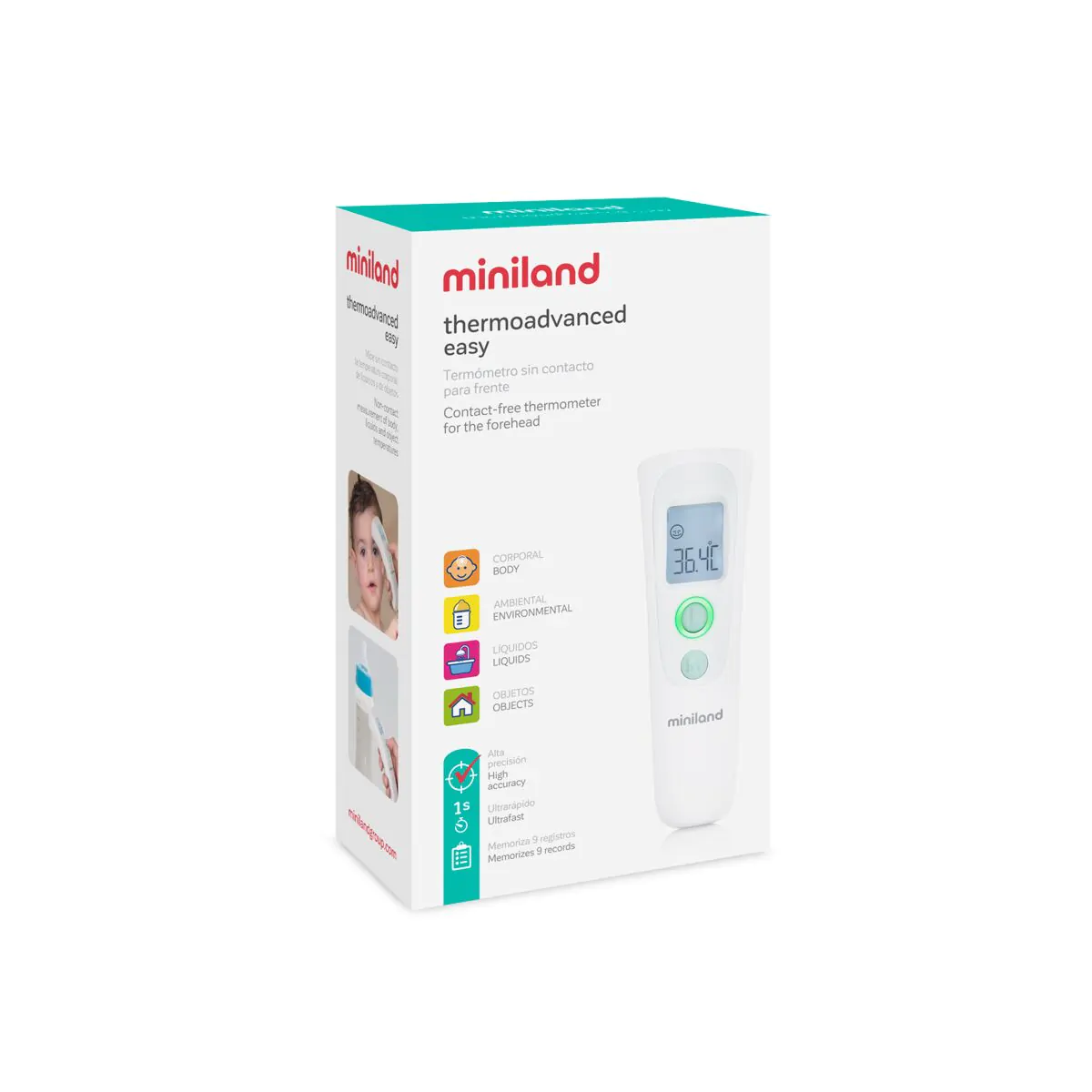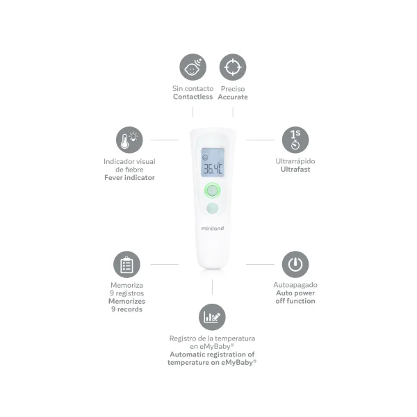 Medición rápida, precisa y sin contacto. thermoadvanced easy mide la temperatura de tu bebéen la frente y en tan solo 1 segundo sin necesidad de contacto. Puede también medir la temperatura del agua del baño, de los alimentos (biberones y papillas) y la ambiente.Medición rápida, precisa y sin contacto Mide la temperatura en tan solo 1 segundo sin contacto en la frente. Lo que lo convierte en el termómetro ideal para toda la familia, ya que al no entrar en contacto con el cuerpo, se puede compartir manteniendo la higiene.Medición de objetos y líquidos Con thermoadvanced easy, los papás podrán medir la temperatura del biberón, la papilla o el agua del baño, ya que permite medir la temperatura de líquidos y objetos.Mide la temperatura ambiental Permite conocer en todo momento si la temperatura en la habitación del bebées óptima gracias a la medición de la temperatura ambiental.Permite controlar la evolución de la temperatura Los últimos 30 registros tomados quedan memorizados. Muestra además la fecha y el tipo de medición realizada, permitiendo comprobar la evolución de la temperatura del bebé.Indicador luminoso de temperatura El botón de medición se ilumina en color verde cuando la temperatura estápor debajo de los 37.9ºC y en rojo con temperaturas superiores. Indicando de una manera muy visual e intuitiva la presencia de fiebre.Desconexión para ahorrar energía thermoadvanced easy se apaga automáticamente al minuto de estar en reposo, permitiendo asíun mayor ahorro de energía y mayor duración de las baterías.