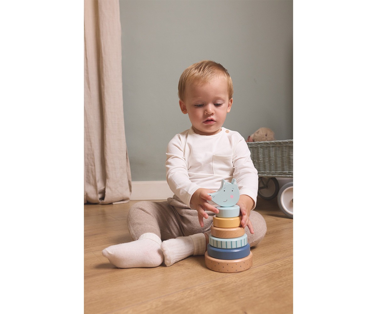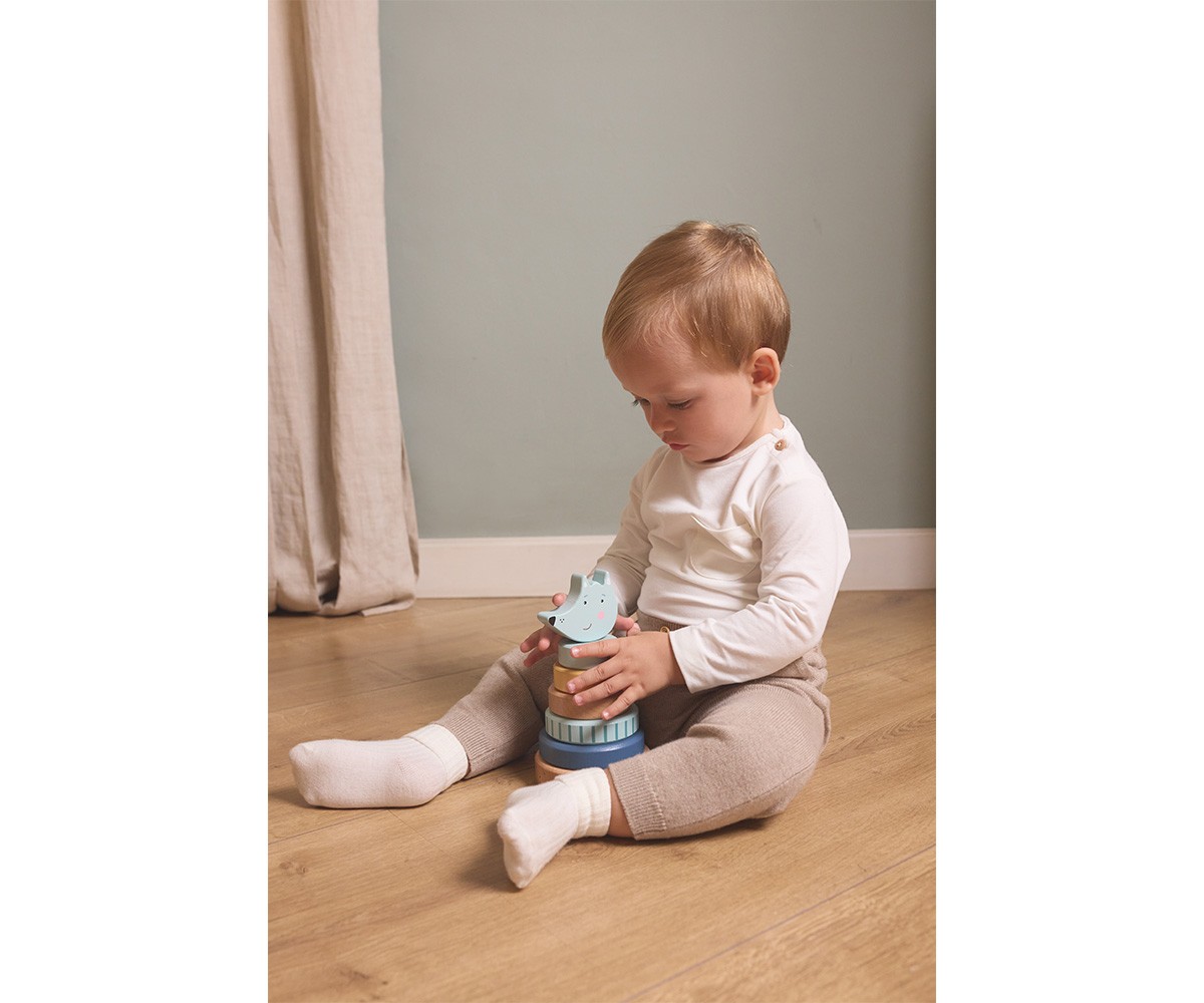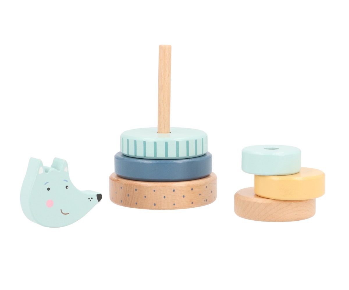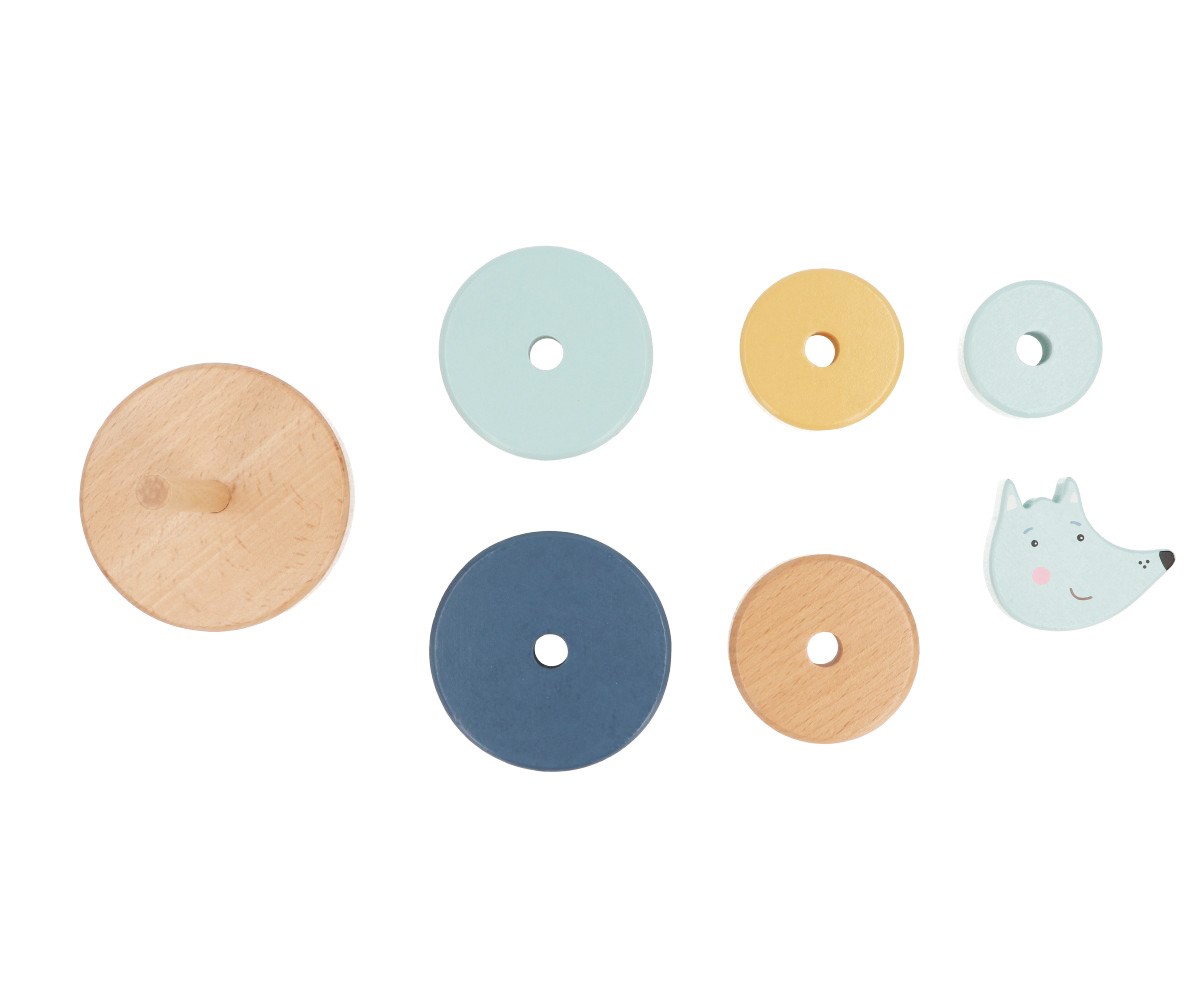 Este apilabe está formado por un soporte con eje en el que los niños deberán encajar las distintas piezas con forma de anilla en el orden correcto. La última pieza es un adorable Lobo.