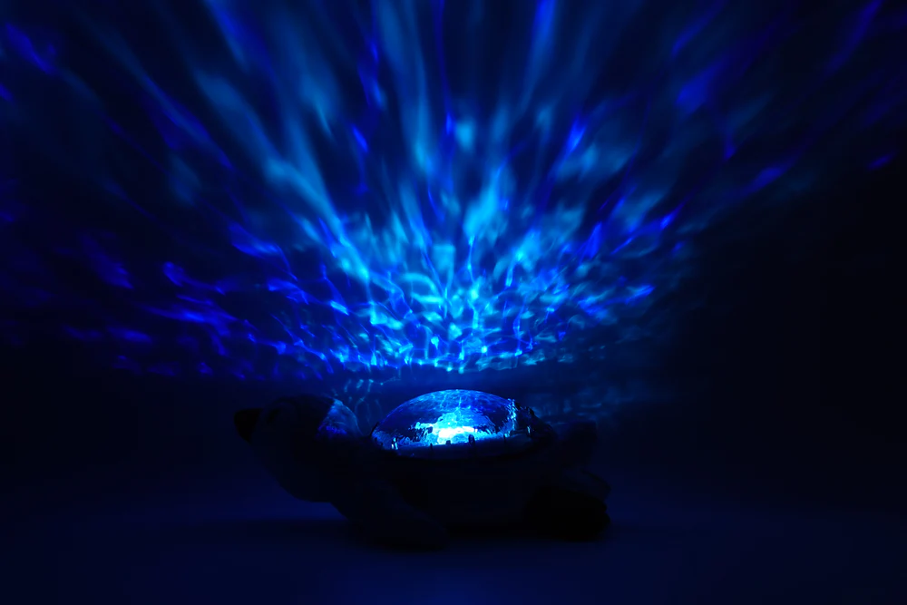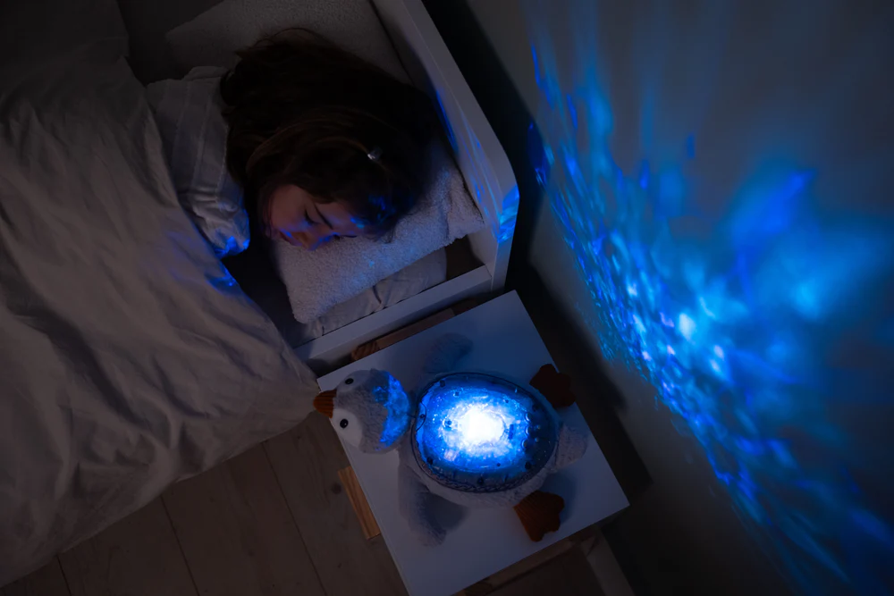 Tranquil Penguin™ es una bonita luz nocturna con música, fabricada con tejido y relleno de poliéster 100% reciclado, que proyecta efecto de luz polar subacuática en movimiento en el techo del dormitorio de los niños, niñas.