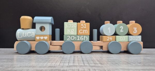 ¡Volemos en tren! Este tren de madera FSC está listo para una nueva aventura. Usa tu imaginación para construir el tren utilizando los bloques de apilamiento en variasformas y colores de ensueño. Existen 3 vagones para apilar con un pájaro, flores, mariposas y una mariquita. Desafía a tu pequeño para crear diferentes combinaciones que apoyan la coordinación ojo-mano y las habilidades motoras finas. También es un buen accesorio para la guardería.