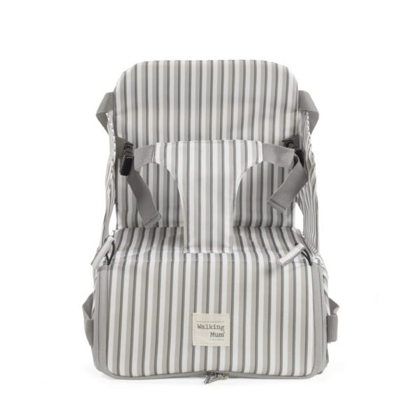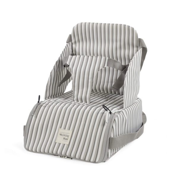Esta trona portátil para bebés Botton rayas es la solución perfecta para padres en movimiento que desean ofrecer a sus pequeños un asiento seguro y cómodo en cualquier lugar. Con un diseño moderno de cuadros en tonos neutros, esta trona que combina funcionalidad y estilo es la solución perfecta para alimentar a tu bebé en cualquier lugar. Su diseño plegable permite llevarla fácilmente a cualquier lugar, ya sea a un restaurante, de viaje o a la casa de los abuelos. Cuenta con una correa para llevarla cómodamente al hombro. Incluye un compartimento de almacenamiento en la base, perfecto para guardar pañales, toallitas u otros accesorios esenciales del bebé. Se adapta a la mayoría de las sillas de adulto estándar, ofreciendo versatilidad y comodidad en diferentes entornos. Incluye correas ajustables para fijarla de manera rápida y segura a al respaldo y al asiento. Las medidas mínimas de las sillas de adulto para poder fijar la trona son: altura mínima de respaldo 48.5 cm, anchura mínima del asiento 36 cm y profundidad mínima del asiento 34 cm. Dispone de arnés ajustables para sujetar bien al bebé proporcionando máxima seguridad durante las comidas. Fabricada con materiales de alta calidad, duraderos y resistentes, ideal para el uso diario. Es muy fácil de limpiar ya que es completamente desenfundable. Esta silla portátil está destinada para bebes que puedan mantenerse sentados por si solos. Desde los 6 meses hasta máximo 3 años o un peso máximo de 15 kgs. Cumple con la normativa EN 16120:2012+A2:2016. Asiento elevador. Walking Mum protege a tu bebé utilizando los mejores tejidos, libres de colorantes azoicos y sustancias nocivas para la salud. Especificaciones: Materiales: 100% Poliéster. Medidas cerrada: 29x36x31 cm.